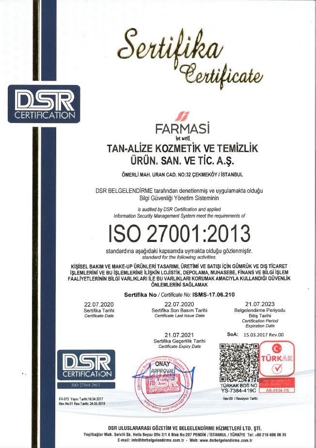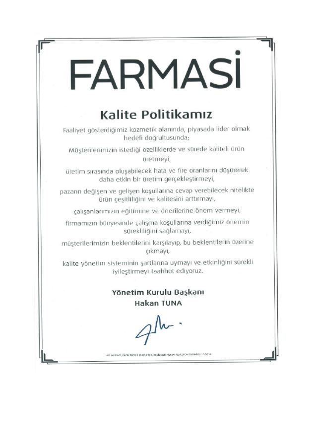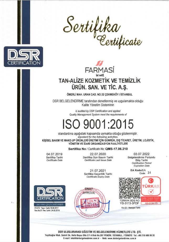Farmasi ve Dr. Cevdet Tuna markaları tüm ürünler, Farmasi laboratuvarlarında, insan sağlığını koruyan, en yüksek kalite standartlarında ve çevre dostu yöntemlerle üretiliyor. Bağımsız uluslararası firmalar tarafından verilen sertifikalar da formüllerin güvenilirliğini tescil ediyor.